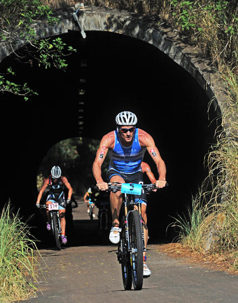 Josiah Middaugh passes Richard Murray at Mile 5 of the bike. Middaugh went on to 4th place, Murray, who said his tank was empty this day, faded to 12th.
