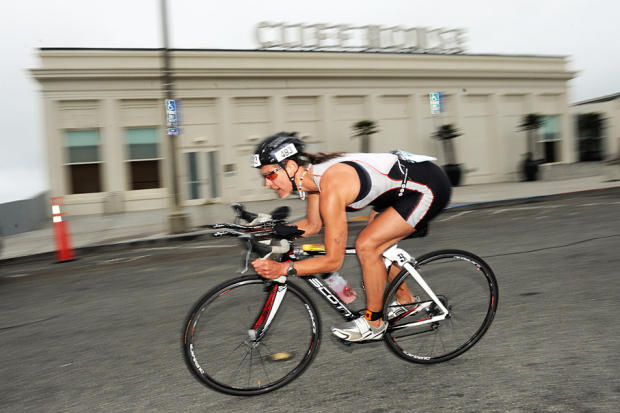 Flying on the steep downhill at the San Francisco Triathlon at Alcatraz.