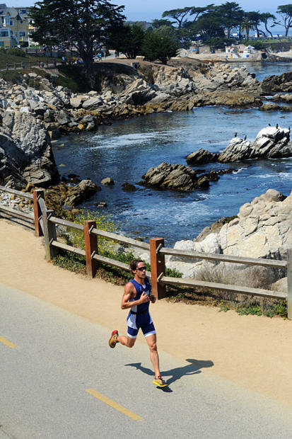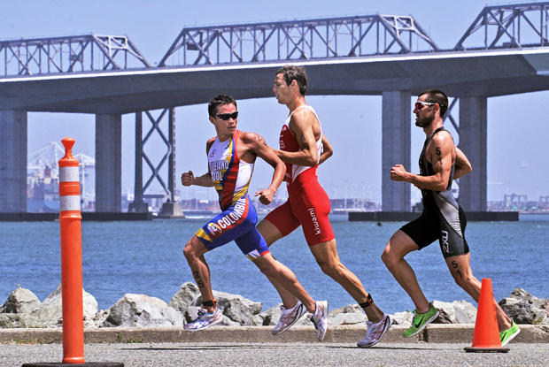 Brian Fleischmann retreating back to the course after going up the wrong sand ladder at the San Francisco Triathlon at Alcatraz.