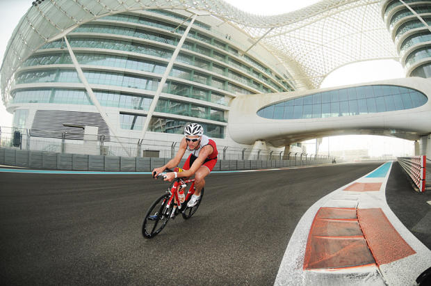 Leon Griffin rides the Yas Marina circuit on the bike leg at Abu Dhabi.
