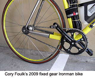 Foulk did Ironman Hawaii in 2009 on a fixed gear bike which he says was tougher than the beach cruiser despite some high end components like Zipp wheels on his strange hybrid steed. Perhaps sensitive to how his beach cruiser experiment affected Ironman officials back in 1996, this time Foulk did it in stealth fashion.