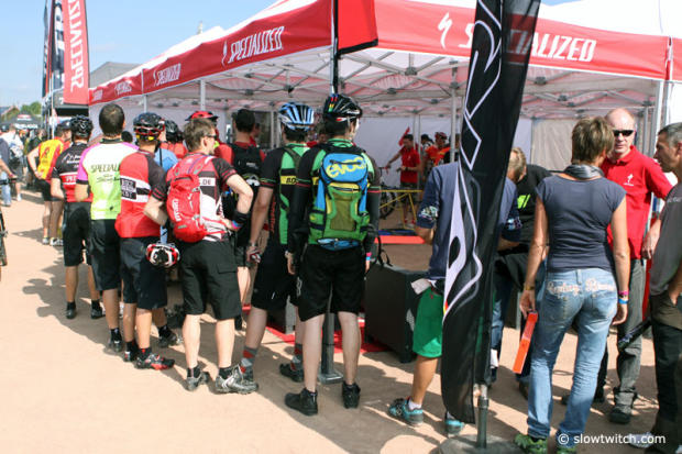 Several empty racks in the Cannondale booth and folks are still lining up.