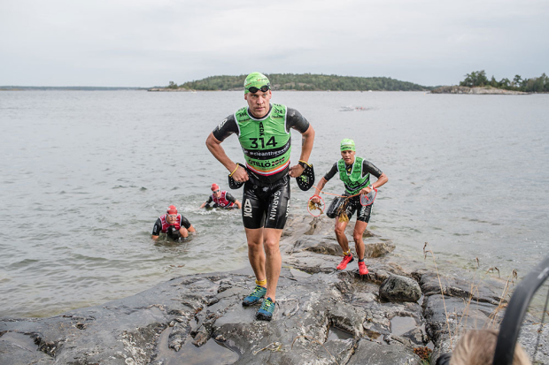 The men's race was very tight and here Pontus Lindberg of Team ATG Sport is seen leading team mate George Bjälkemo, the defending champions Fredrik Axegård and Alex Flores of Team ARK Swimrun and Lars Ekman and Jonas Ekman Fischer of the Sailfish team Bröderna Bäver out of the water late in the race.