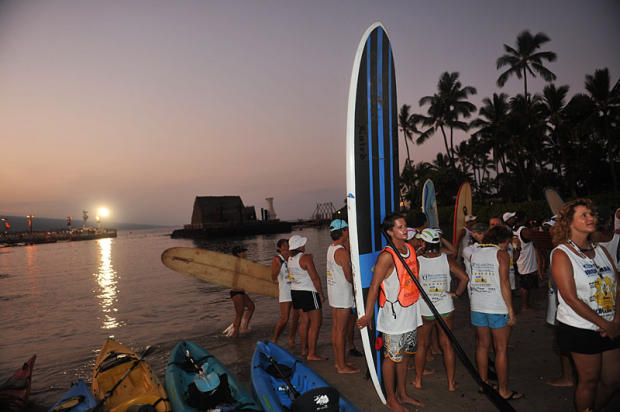 Water safety volunteers ready their paddleboards on the beach beside the King Kamehameha hotel.