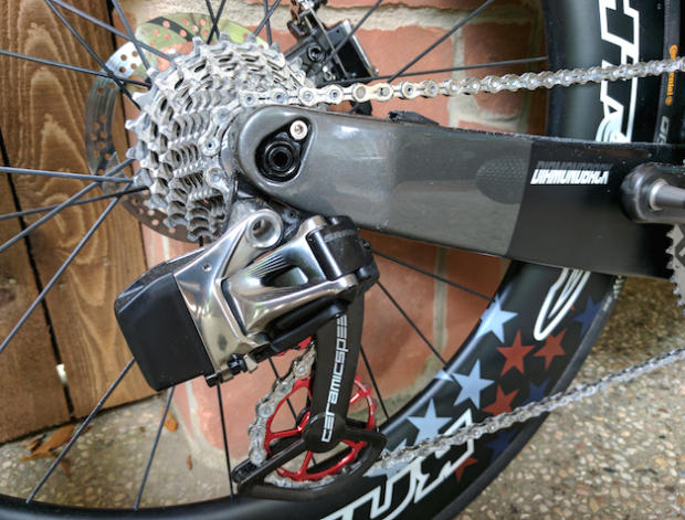 Beefy chain stays on the Andean. Russell uses CeramicSpeed's Oversized Pulley Wheel System set up for SRAM as well as their UFO Chain and proprietary squirt lube.
