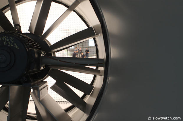 These big fans in this open design tunnel suck the air at whatever speed is set in the control room.