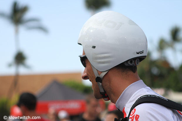 With two very big marketing campaigns in Kona it is not surprising to see Rudy Project leading the helmet count, but they are in fact part of an apparent trend that less is enough. Long tailed helmets are now part of a disappearing species, and aero road helmets seemed to be especially popular, or at the very least trending.