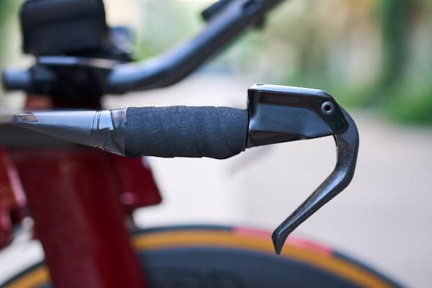 He opts for a very thin set of tape on the base bar, and stopping power is provided by SRAM.
