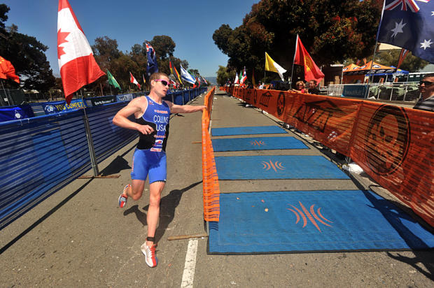 Gwen Jorgenson was the final member of the women's podium to arrive at the Treasure Island finish.