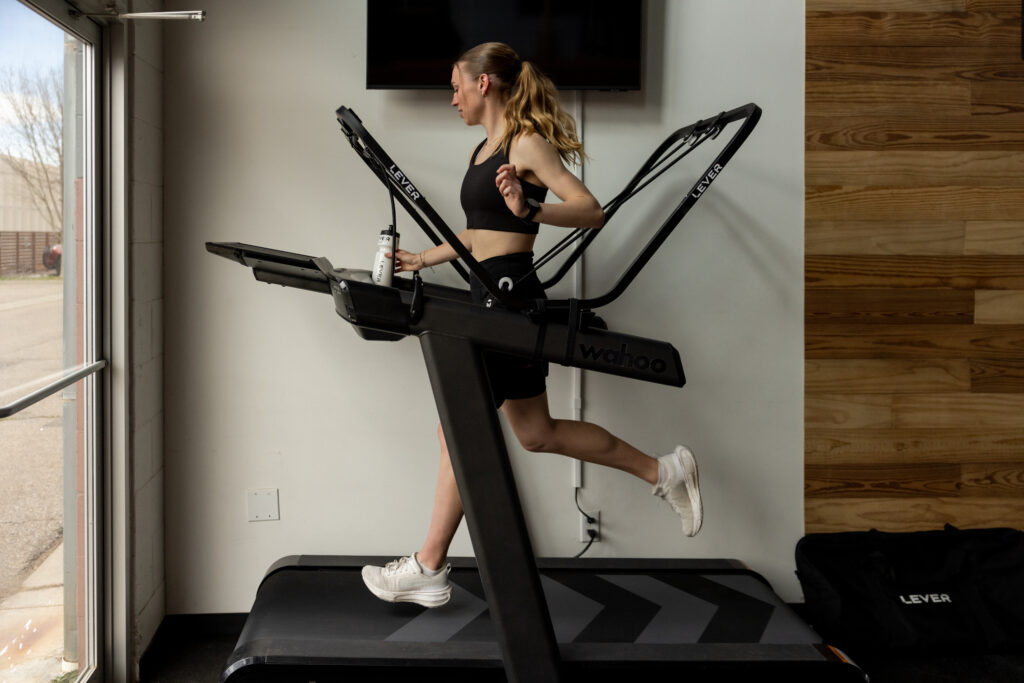 If you’ve never heard of or seen a Lever, it’s a running harness for a treadmill. It kind of looks like a baby jolly jumper but for adults–and it’s an incredible piece of equipment (that in my opinion feels pretty close to an AlterG). The metal frame easily attaches to any treadmill and then a heavy-duty elastic rope connected to the frame is threaded through loops on a pair of special shorts worn by the runner. The elastic is then reattached to the frame through a one-way carabiner where you can control the amount of support by how much rope you pull through. You can take up to 45 lbs (24 kg) off your body weight and work your way back up to full weight. It’s also a great tool to use even if you aren’t injured to help manage the stress on your body and prevent injury, something Flora Duffy, Laura Philipp, Marjolaine Pierré and Paula Findlay all do.