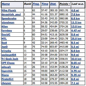 If you take the same 100/100 run challenge and rank these folks by points, earned instead of by run sessions accrued, all of a sudden we have a different leader. It's well-known duathlete Mike Plumb, and if we click on his name we'll go to his training log on Slowtwitch and we can see why this is the case. His chart is below. If you look at recent activity, Mike's work is fairly balanced, that is, while a lot of those in the 100/100 run challenge have been running almost exclusively, Mike's been getting in a lot of rides and swims, and accruing "aerobic points." You can read more about our aerobic points system, which has now been in use for several decades, here.