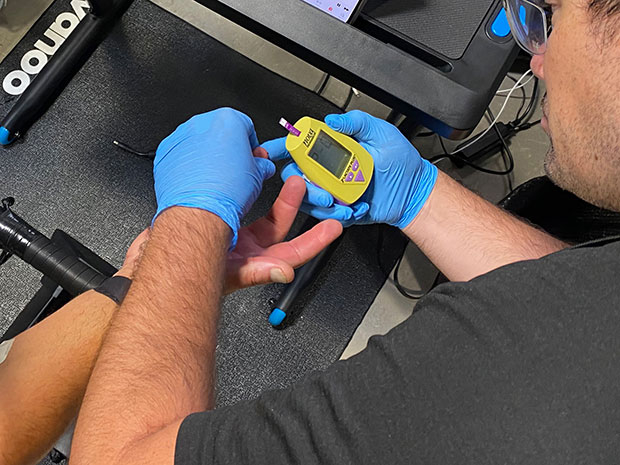 That same pain room is also set up to test blood lactate accumulation (above) and sweat rate (below). I watched the Center’s head, Neal Henderson, demo a test, which is no trivial matter. It’s not waterboarding, but to call it asphyxiation is not far off. Followed by needle poking or, in Neal’s case, needle poking every 3 minutes during the asphyxiation.