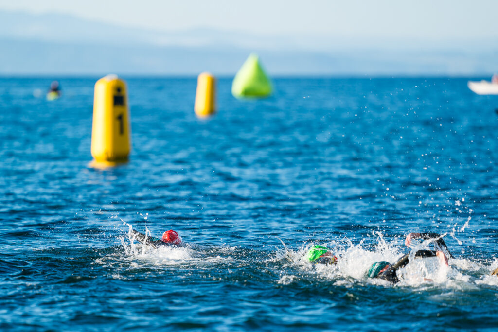 … But powered out to the lead over the first few hundred meters. “Good luck with your goggle choice,” she warned the men after the race, referring to her difficulties navigating the first turn buoy.