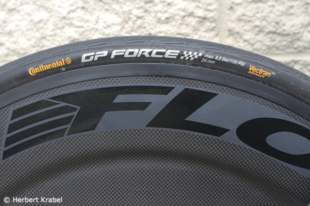 The FLO DISC clincher disc in the back has a 24mm Continental GP Force on it with a Vittoria Latex tube underneath.