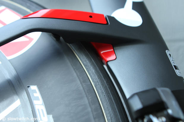 The Argon 18-developed front brake also is hidden under a cover. Adjustments can be made through the small hole on each side.