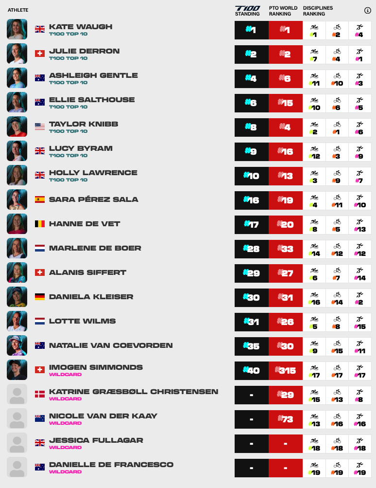 With the new T100 system no longer including athlete contracts, athletes are offered starting slots based on: “the top-10 athletes in the 2025 T100 Standings; the top-5 athletes in the 2025 T100 Contender Rankings; additional Contender Rankings athletes (in order) if any T100 Top-10 athletes decline their spots; 2 discretionary Wildcard athletes.”